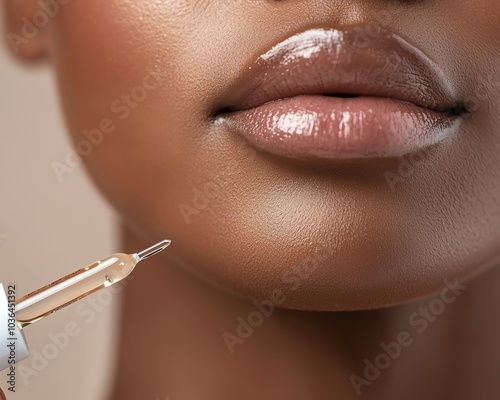 Obraz premium Close-up of a woman's lips receiving a skincare serum. Shows smooth, hydrated skin, highlighting beauty and skincare routine.