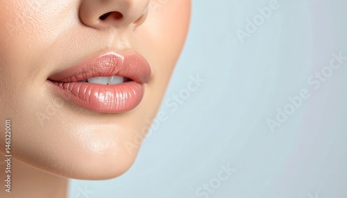 © Pastel, Obraz premium Close-up of a woman's lips, showcasing a natural, polished look with a soft sheen against a light background