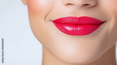 Obraz premium Close-up of a woman's lips with bold red lipstick, glossy finish and smooth texture, radiant skin tone, studio beauty shot highlighting makeup details, feminine and elegant beauty concept
