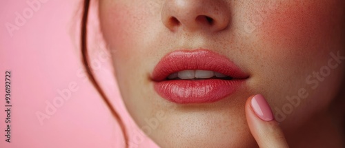 © raja, Obraz premium Close-up of a Woman's Lips with Pink Lipstick and Freckles