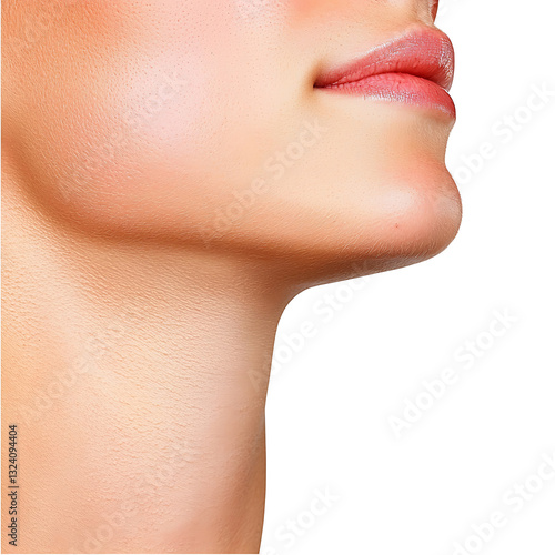 © watz, Fototapeta premium Close-up of a woman's lower face highlighting her smooth skin defined jawline and softly tinted lips against a white background.