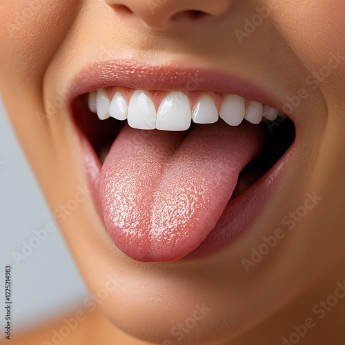 © ruangrit19, Obraz premium Close Up of a Woman s Mouth Sticking Tongue Out Towards on White Background