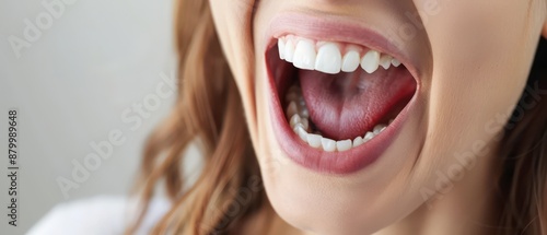 Obraz premium Close Up Of A Woman's Open Mouth With White Teeth And Pink Lips