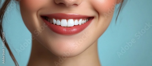 Obraz premium Close-up of a Woman's Smile On Soft Blue Background. Beautiful Smile Of...