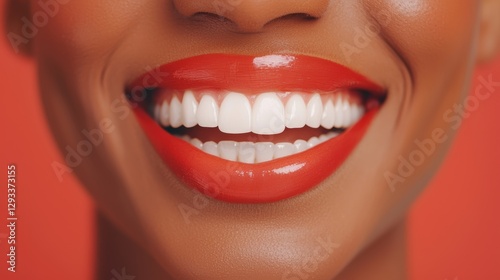 © Sariyono, Obraz premium Close up of a woman's smile with red lipstick and perfect white teeth. Beauty and dental care concept.