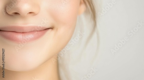 Fototapeta premium Close-up of a woman's smiling lips and chin, soft focus on the background.