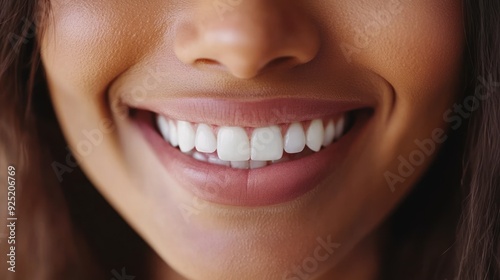 © Iswanto, Fototapeta premium Close-up of a woman's smiling mouth, showing white teeth and pink lips.