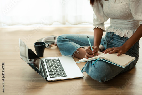 © amnaj, Naklejka premium Close-up of a woman sitting on the floor holding a pencil and taking notes using a laptop at home.