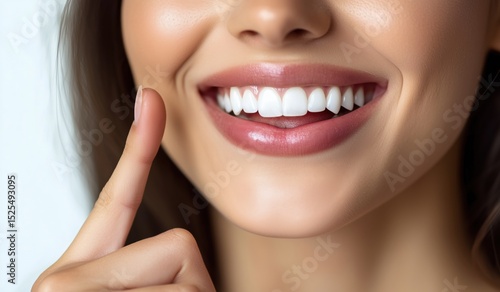 Fototapeta premium Close-up of a woman smiling showing healthy teeth and holding a finger to her...