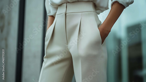 © Elnare, Naklejka premium Close-up of a woman wearing high-waisted, cream-colored pants.