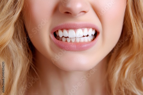 © Lens Focus, Fototapeta premium Close up of a woman with blonde hair clenching her teeth showing a perfect white smile to the camera
