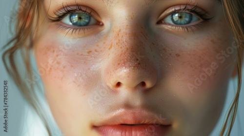 Fototapeta premium Close up of a woman with freckles on her face, suitable for beauty and...
