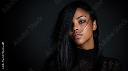 Fototapeta premium Close-up of a woman with long dark hair posing against a dark background in a studio setting during a photoshoot session