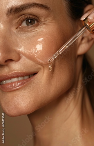 Obraz premium Close up of a woman with one glass dropper in front of her cheek. The liquid...