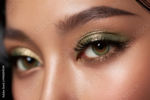 © Ксения Левашова, Obraz premium Close up of a womans eye with green and gold eye shadow