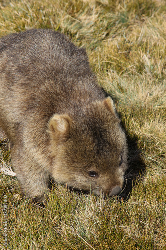 Naklejka premium Close up of a Wombat roaming feeding on grass, Cradle Mountain NP, Tasmania