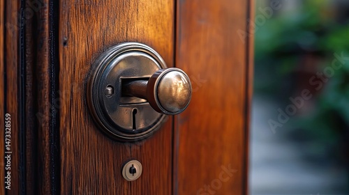 © 2026 photo, Fototapeta premium Close up of a wooden door with a metal doorknob and keyhole showing a blurred outdoor background