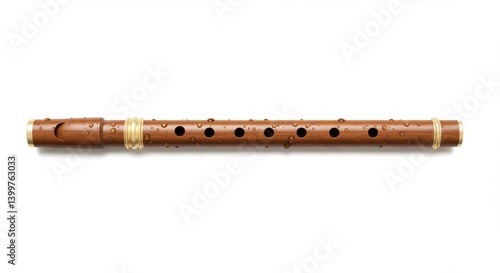© boztaga, Naklejka premium Close-up of a wooden flute with water droplets, showcasing craftsmanship and musical potential - flute wood