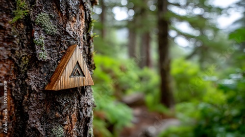 © OnuTH, Fototapeta premium Close Up of a Wooden Trail Marker on a Tree in a Lush Green Forest Pathway