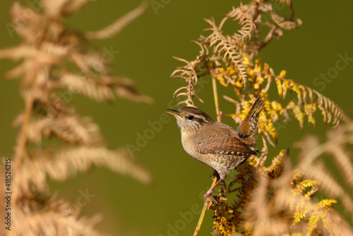 © giedriius, Fototapeta premium Close up of a wren perched on a fern in autumn