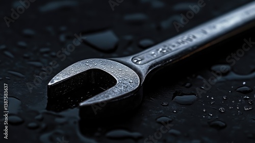 Fototapeta premium Close-up of a wrench on a dark surface with water droplets