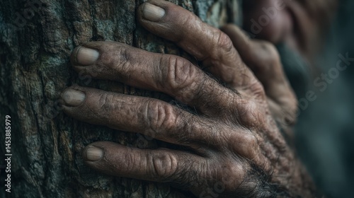 © khumthong, Fototapeta premium Close up of a wrinkled hand touching the rough texture of tree bark showcasing the connection between people and nature