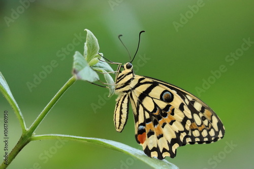 © Danielle, Fototapeta premium Close-Up of a Yellow Swallowtail Butterfly with Intricate Yelllow, Black and Orange Patterns on a Green Leaf