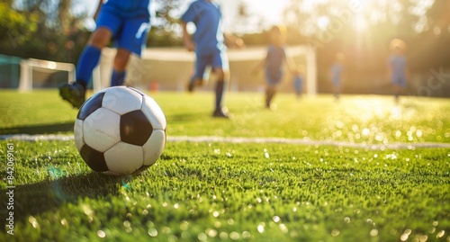 Fototapeta premium Close up of a young boy soccer player kicking a ball on a green field with a blurred team.