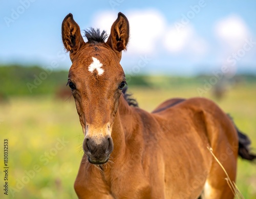 Obraz premium Close-up of a young foal with a white marking on its forehead