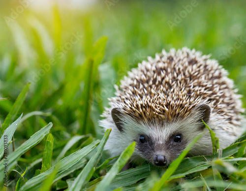 Fototapeta premium Close-up of a young hedgehog on the grass, Indonesia
