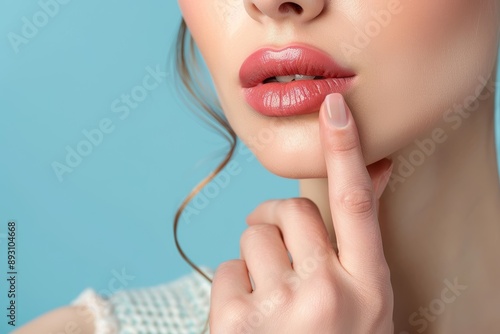 © MUNUGet Ewa, Fototapeta premium close-up of a young lady with lovely lips against a blue backdrop