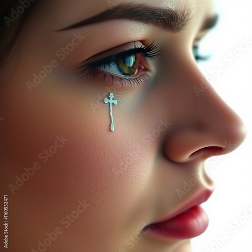 Fototapeta premium Close-up of a young woman's face, a small cross delicately placed near her eye. A poignant and artistic image.