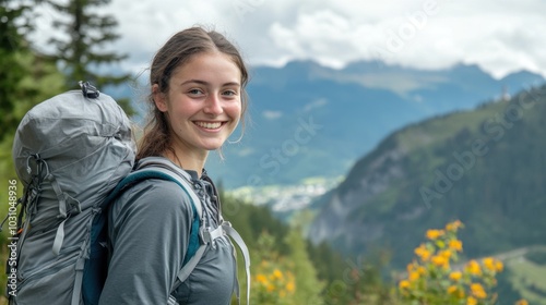 © Lion, Naklejka premium Close-up of a young woman with a backpack, smiling as she stands against a stunning natural landscape. The backdrop features lush greenery and majestic mountains, the joy of hiking and adventure.