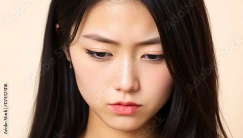 Obraz premium close-up of a young woman with long, dark hair and a serious expression. She has defined eyebrows and natural-looking makeup, which highlights her thoughtful demeanor.