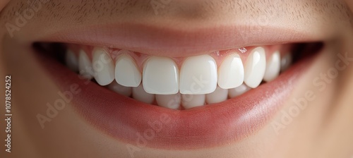 Fototapeta premium Close-up of a young woman with perfect white teeth smiling. Dental care and...