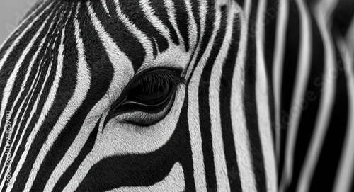 Fototapeta premium Close up of a zebra head with focused eye and blurred stripes in monochrome