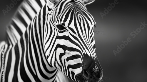 © Alpha, Fototapeta premium Close-up of a zebra stallion's head in an African meadow, intricate black & white detail, focus on unique stripe patterns