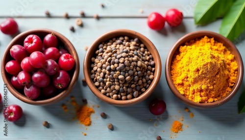 © Chalermrach, Fototapeta premium Close-up of acai, goji berries, chia seeds, and turmeric powder in small bowls, natural, chia seeds
