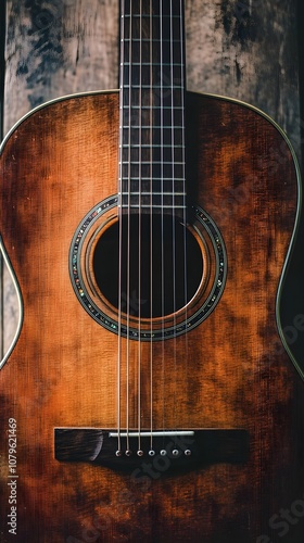 © Spectrum, Fototapeta premium Close up of acoustic guitar on wood background