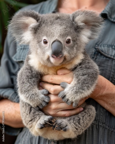 Obraz premium Close-up of adorable baby koala in the arms of an unidentified man against a...