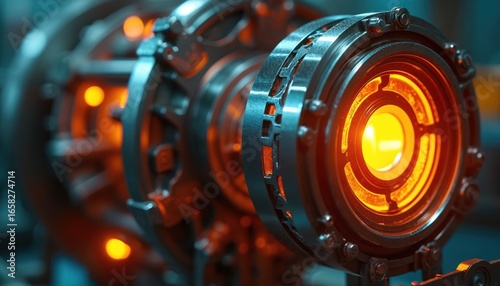 Fototapeta premium Close-up of advanced machinery with glowing orange components, emphasizing...