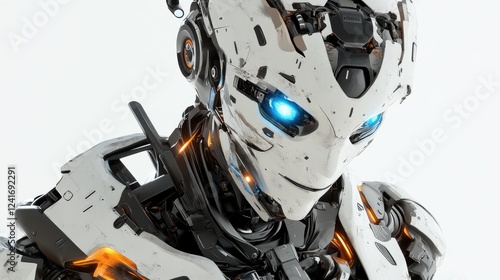 Fototapeta premium Close-up of advanced robot head, futuristic design, against white background, possible use in sci-fi concept