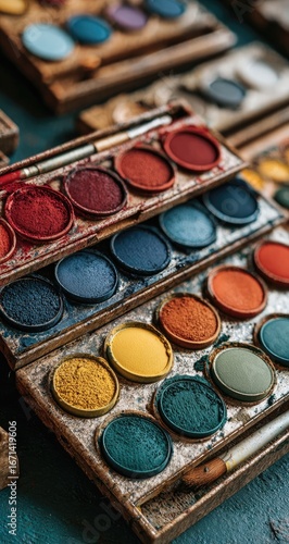 Naklejka premium Close-up of aged paint palettes, showcasing a variety of vibrant pigments. Wooden, metallic, and colorful paint wells are visible. A paintbrush is partially visible