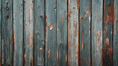 Naklejka premium Close-up of aged, weathered wooden planks with chipped paint and peeling varnish, showcasing rich texture and rustic character, ideal for nostalgic projects like scrapbooking or junk journaling.