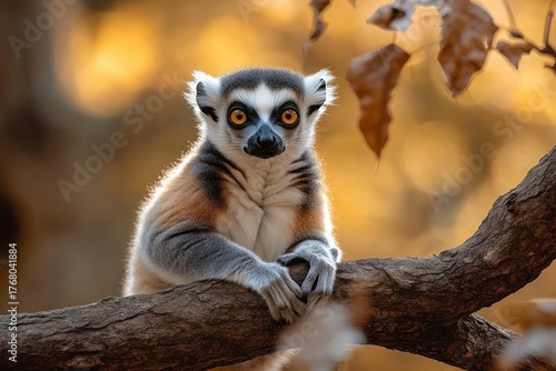 © Aleksandra, Obraz premium close-up of alert lemur sitting on tree branch surrounded by autumn leaves with warm golden background