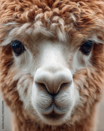 © grey, Obraz premium Close-up of alpaca with fluffy hair and gentle expression.