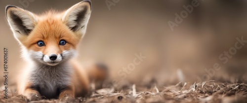 © NightTampa, Obraz premium Close-up of an adorable baby fox with large ears, lying down on a blurred natural background. Perfect for wildlife and nature themes.