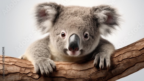 © ORG, Fototapeta premium Close-up of an adorable koala clinging to a branch, captured with clarity and precision, set against a white background for easy integration into designs