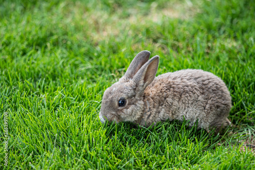 © Yi, Fototapeta premium close up of an adorable young bunny with curled fur eating on green grass field