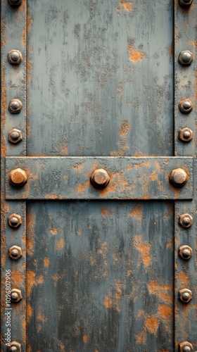 Fototapeta premium Close-up of an aged metal door with a weathered, rusty surface and bold rivets, showcasing textures of decay.